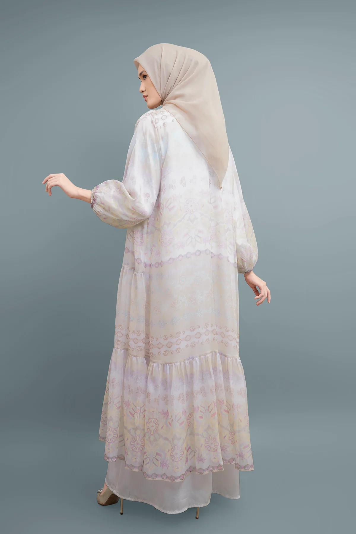 Boasting a flowy and airy silhouette with floral prints illustrated in tribal style. Featured with voluminous sleeves, a tiered accent, and a ruffled hem, this dress will enrich your look with a romantic and playful flair.