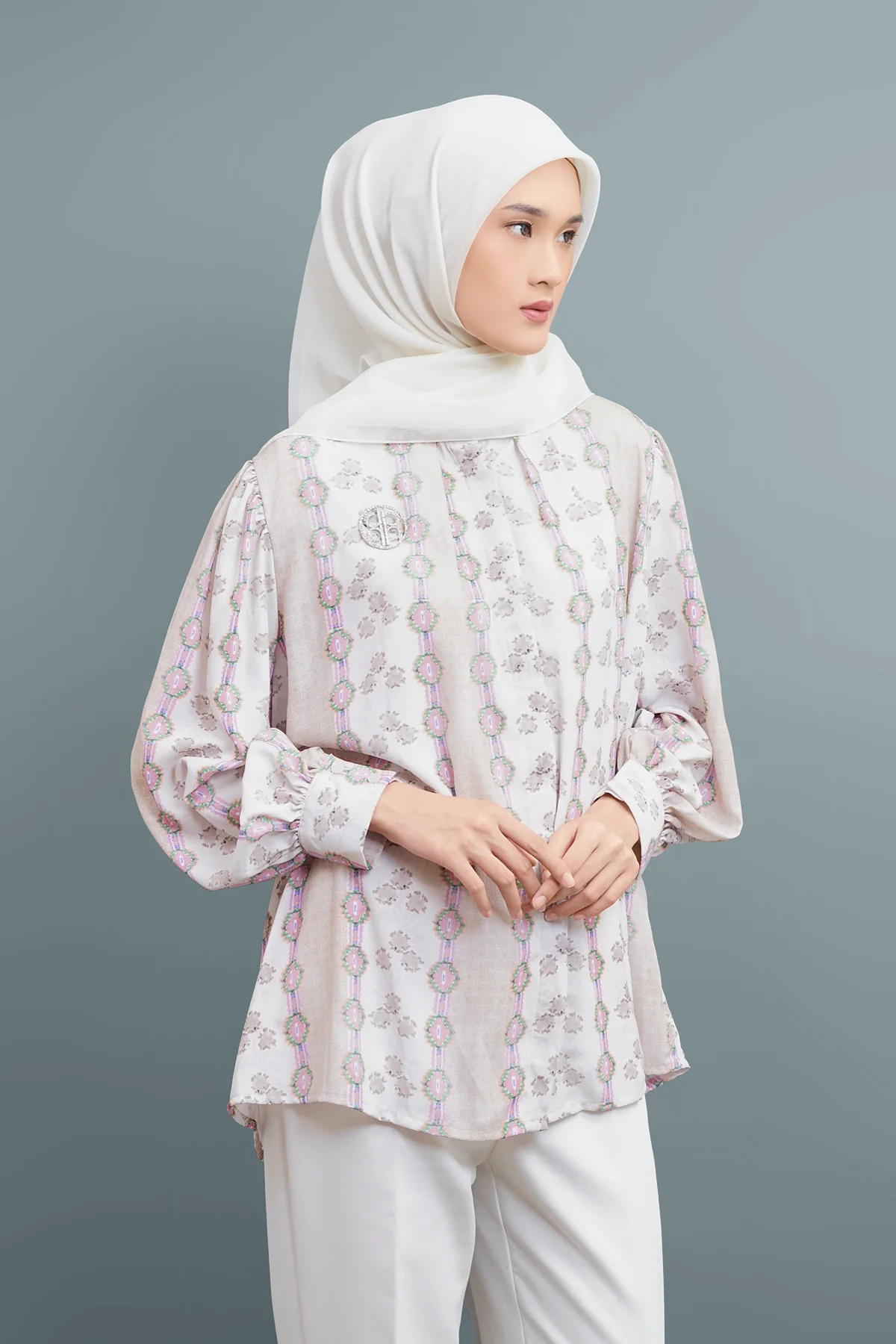 Captivating with unique flair, this blouse is defined by its floral prints illustrated in tribal style. Reinforced with feminine accents, such as pleats and puff sleeves, this blouse will imbue your edits with a touch of femininity as well as refinement.