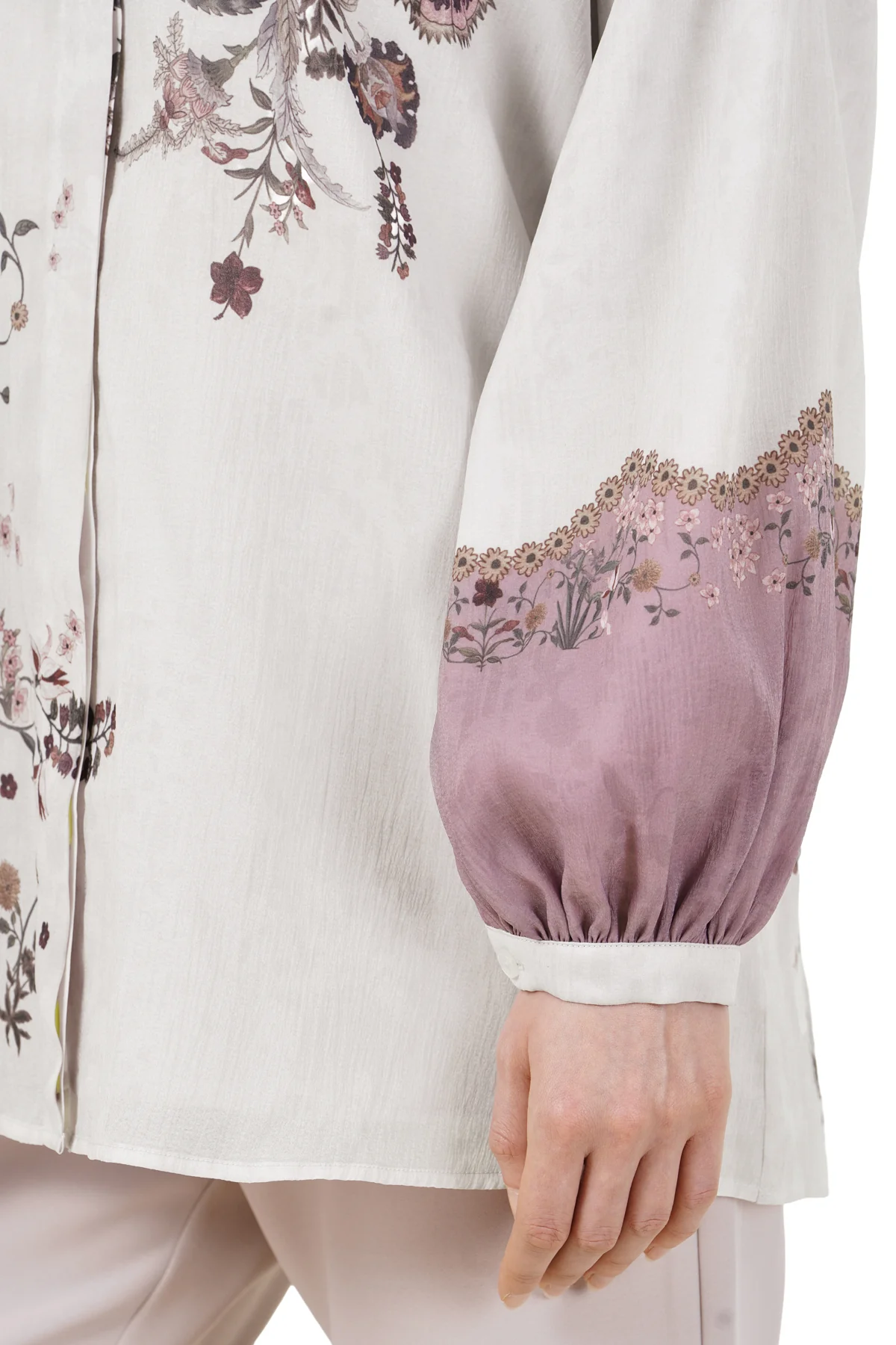 A romantic silhouette inspired by the beauty of vintage florals, this shirt features puff sleeves with contrasting tones, adding volume to its silhouette. It is also designed with a hidden placket and a classic pointy collar, which further elevates its flair.