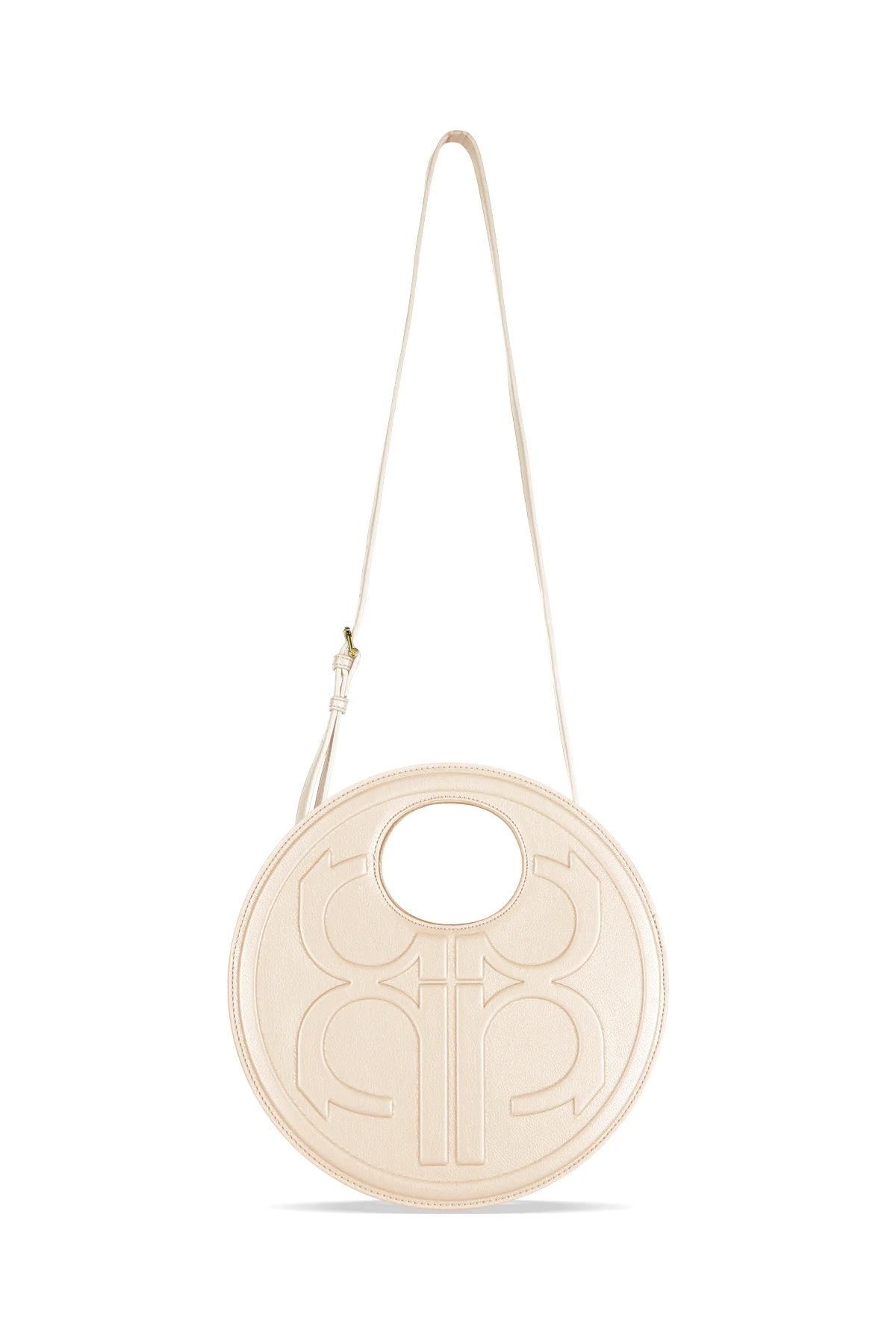 This bag will unquestionably make an iconic statement for elevating your style and ensuring it stands out. With its circular shape and handles seamlessly integrated into its design, along with the embossed monogram "Nada Puspita", it exudes sophistication. It also comes with a detachable strap for added versatility.